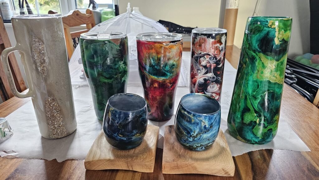 For this category I am submitting five resin and alcohol ink stainless steel tumblers, a resin and alcohol ink vase, a set of resin art and alcohol ink whiskey glasses with accompanying smoking coasters and a mini 20x20cm diptych painting which has been resin coated and will go on stands (see below).