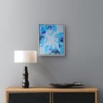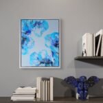 Soft layers of blue, grey and white flow across the surface, merging and separating like shifting clouds over frozen water. The pour was guided with deliberate restraint, allowing the paint to move freely while maintaining compositional harmony – a dance between control and surrender. Metallic pigments add delicate highlights, glinting like frost beneath pale light.